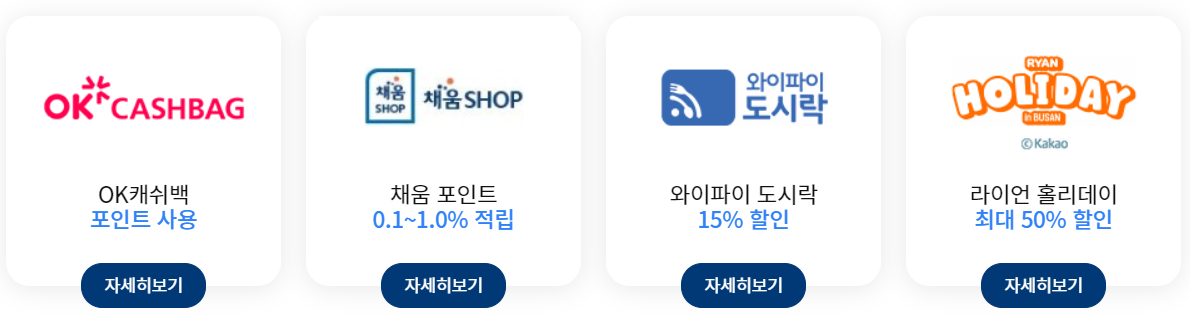 - 채움 공통 서비스는 NH농협카드 및 제휴처의 사정 또는 제공기간 경과 시 변경 또는 중단될 수 있습니다. - 이벤트별 상세 안내는 「자세히보기」 버튼을 클릭하시면 확인하실 수 있습니다. - 채움 공통/채움 [+]PLUS 서비스 중 할인/적립형 이벤트가 동일 제휴처에 중복될 경우 가장 큰 혜택의 이벤트가 제공되며, 중복적용은 제외됩니다.