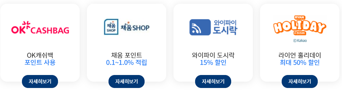 - 채움 공통 서비스는 NH농협카드 및 제휴처의 사정 또는 제공기간 경과 시 변경 또는 중단될 수 있습니다. - 이벤트별 상세 안내는 「자세히보기」 버튼을 클릭하시면 확인하실 수 있습니다. - 채움 공통/채움 [+]PLUS 서비스 중 할인/적립형 이벤트가 동일 제휴처에 중복될 경우 가장 큰 혜택의 이벤트가 제공되며, 중복적용은 제외됩니다.