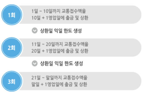 후불교통 서비스 안내 - 발급대상 : 만 18세 이상으로 제주은행이 정한 자격기준을 충족하는 개인회원 - 이용한도 : 1회 (10일주기) 10만원 (월 3회 상환 및 한도 생성) - 이용대상 : 제주/경기지역 시내버스, 지하철(경기 일부 지역 제외) - 상환방법 * 월 3회 결제계좌에서 출금 및 상환 * 상환일에 결제금액을 SMS로 발송 후 출금