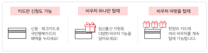 - 국민행복카드는 한장의 카드로 다양한 국가 바우처를 사용할 수 있는 통합 카드입니다. 국가가 지원하는 다양한 바우처와 제주은행이 드리는 풍성한 서비스 혜택을 한 장의 카드로 받아보세요!