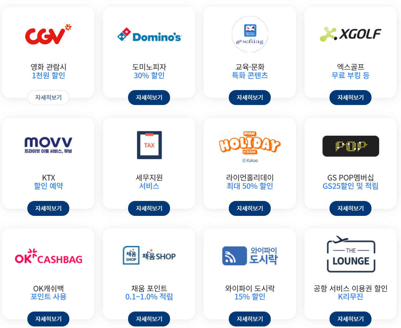버스/지하철/택시/철도 10% 청구할인 - 버스(시내버스, 마을버스, 광역버스, 고속시외버스) 및 지하철, 택시(일반 택시 및 카카오T택시), 철도(일반/KTX/SRT) 렌터카/카쉐어링 10% 청구할인 - 렌터카, 쏘카, 그린카 전기차 충전 10% 청구할인 - 환경부 공공 급속충전기 충전요금 현장결제 및 멤버쉽카드 간편결제