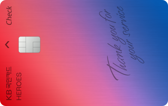 · 병역정보는 공공마이데이터를 연계하여 행정안전부의 주민등록초본 내 전역일자를 확인합니다. 전역 후 주민등록초본 내 전역일자가 반영되는 행정절차 완료까지 일정기간이 소요되므로, 주민등록초본 내 전역일자가 반영 되기 전 히어로즈체크카드 발급을 희망하는 경우, 전역증을 지참하여 KB국민은행 영업점을 내점하시면 자격확인 후 발급이 가능합니다.
