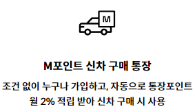 M포인트 신차구매통장 - M포인트에 통장포인트까지 추가 적립해 사용 - M포인트+세이브-오토 포인트+통장포인트+가족 M포인트+S카드 오토 포인트 통합 한도