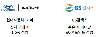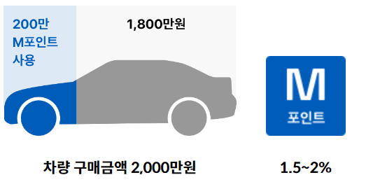 - 현대자동차·기아 · 신차 구매 : 차량 구매 시 결제금액 1.5% M포인트 적립 · 무이자할부 이용 시 적립 제외