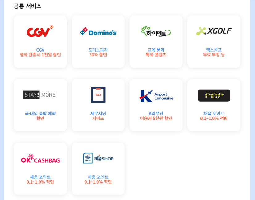 - 결제 건당 5천원 이상 전월실적 30만원 이상 시 서비스 제공