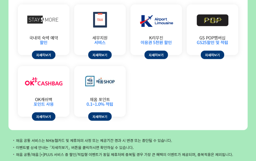 - 카드서비스 적용은 NH농협카드 전산상 등록된 해당 가맹점(업종) 이용금액에 한합니다.